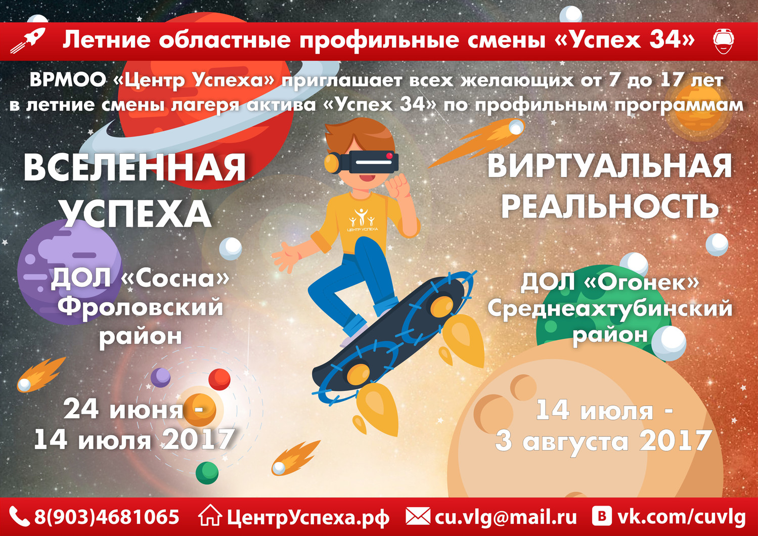 • «Вселенная Успеха» с 24 июня по 14 июля 2017 г. (2 смена) на базе детского оздоровительного лагеря «Сосна» Фроловского муниципального района (далее - ДОЛ «Сосна»);